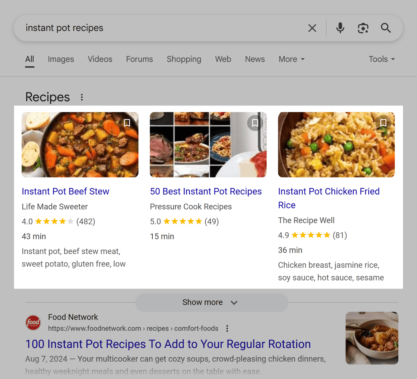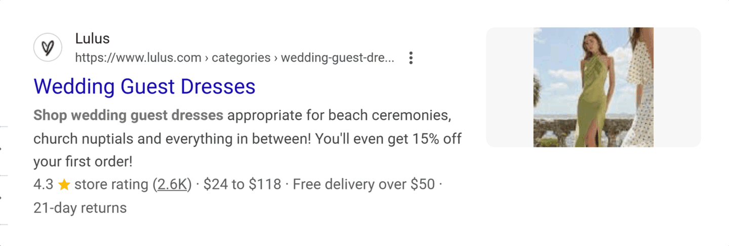 它们可以包括图片、评分、评论和其他结构化数据。它们直接在搜索结果中为用户提供您页面的更具信息量的预览。
