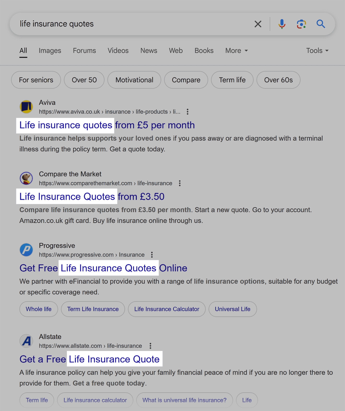 如果您搜索任何有竞争力的关键词,您会注意到排名靠前的页面几乎都在其 title tag 中使用了该确切关键词。