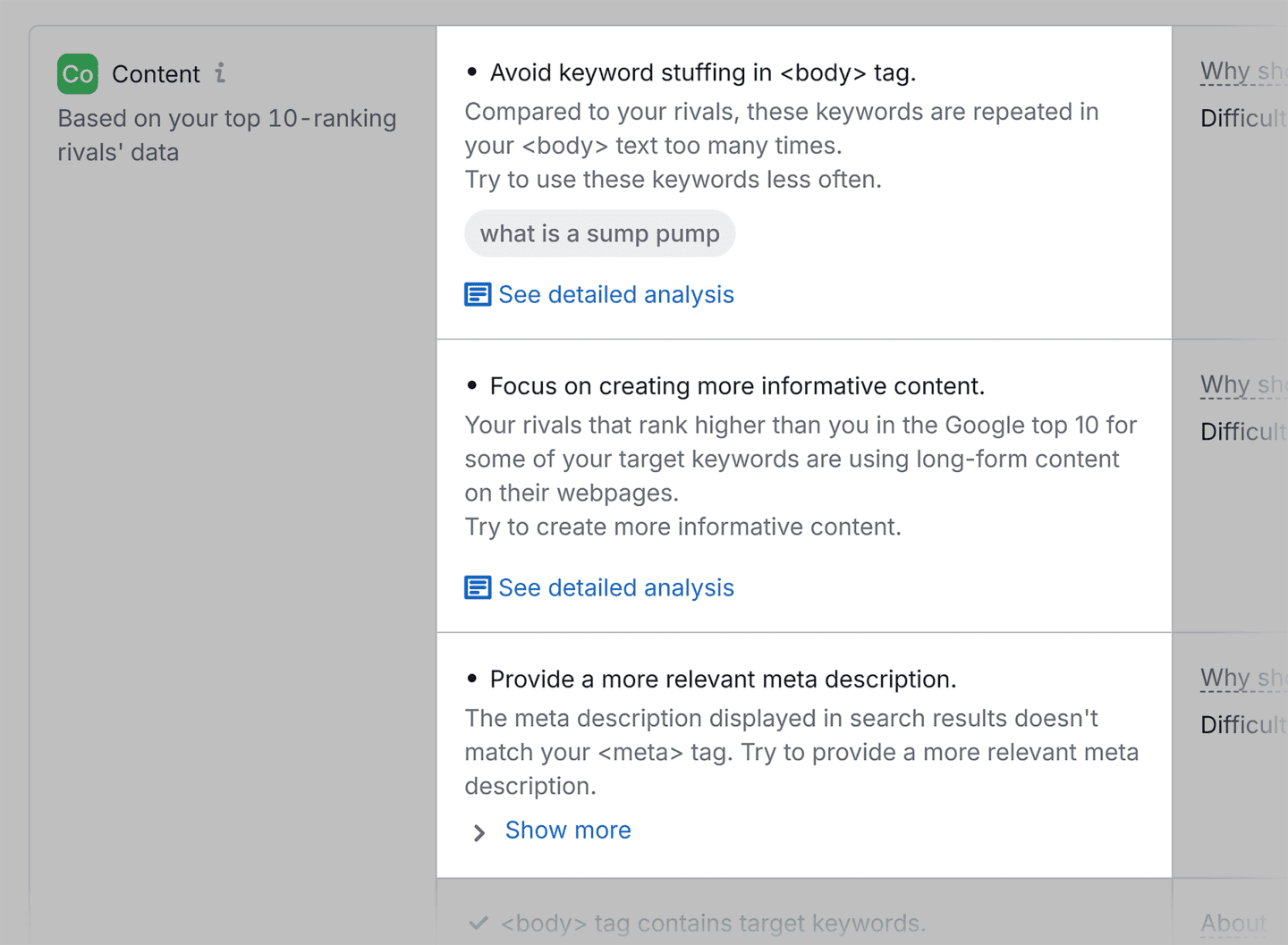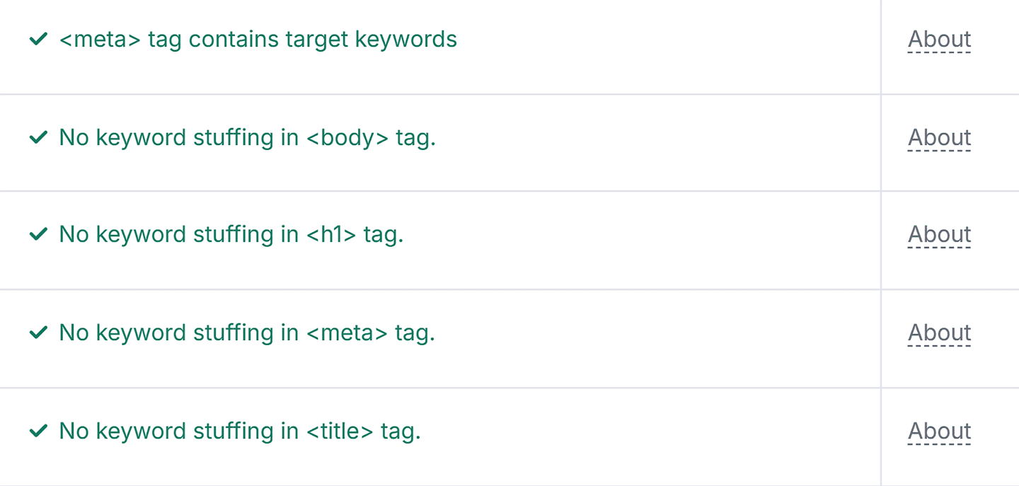 该工具会告诉您是否已将关键词放在所有关键位置,如 H1 和正文内容中(稍后会详细说明为什么这很重要)。