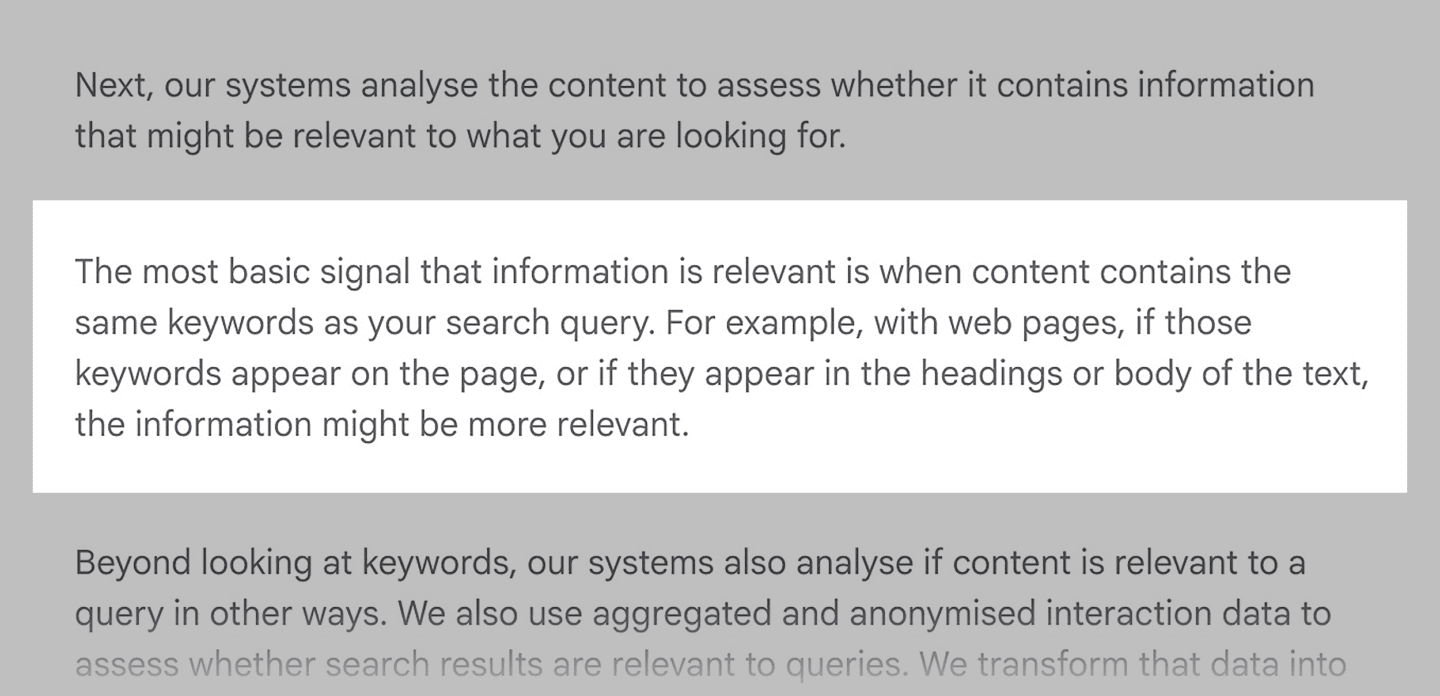 是的!谷歌的“搜索如何运作”报告告诉我们,内容相关的“最基本信号”是页面上存在与用户搜索查询相同的关键词: