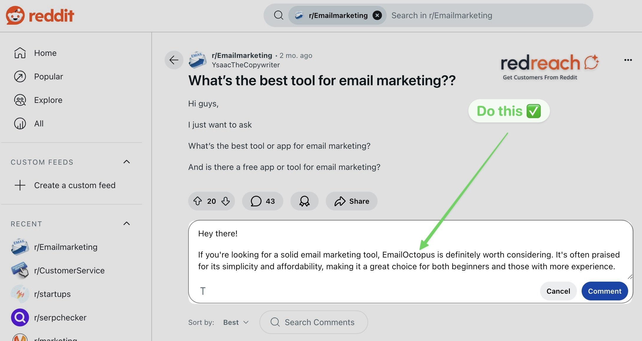 想一想。当有人在 r/entrepreneur 板块里发帖问“对于初创公司来说,最好的邮件营销工具是什么?”,这不仅仅是一个问题。这是一个合格的潜在客户在举手,请求你向他们推销。嗯,差不多是这样……